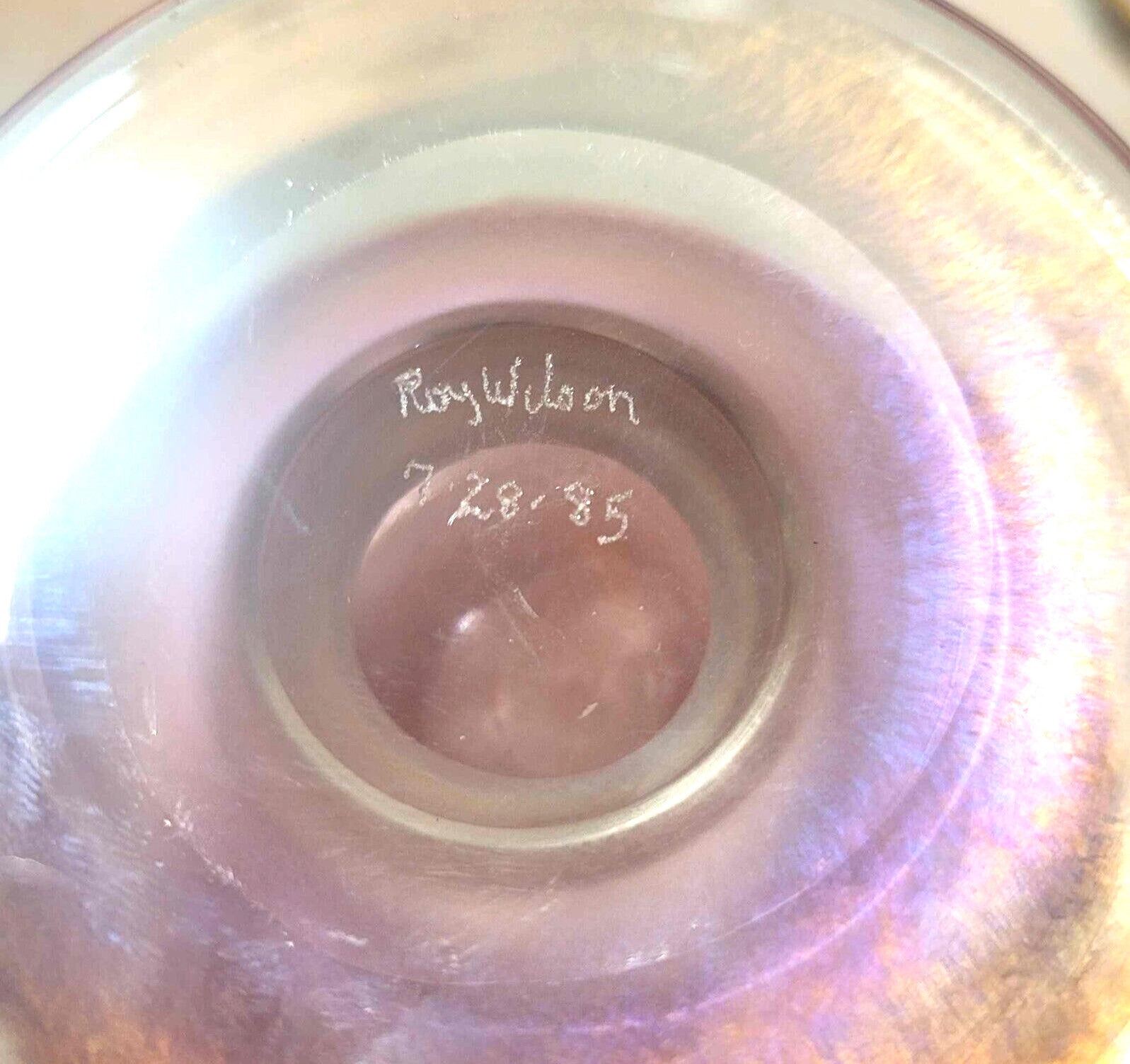 1985 Roy Wilson USA Iridized Blown pink art Glass Vase 8"