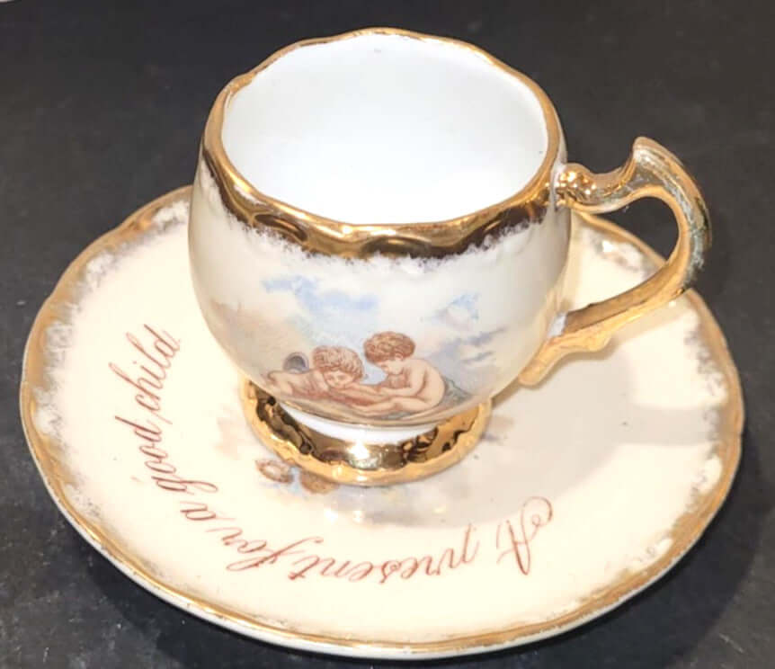 antique german Porcelain small Cup & Saucer - A Present For A Good Child