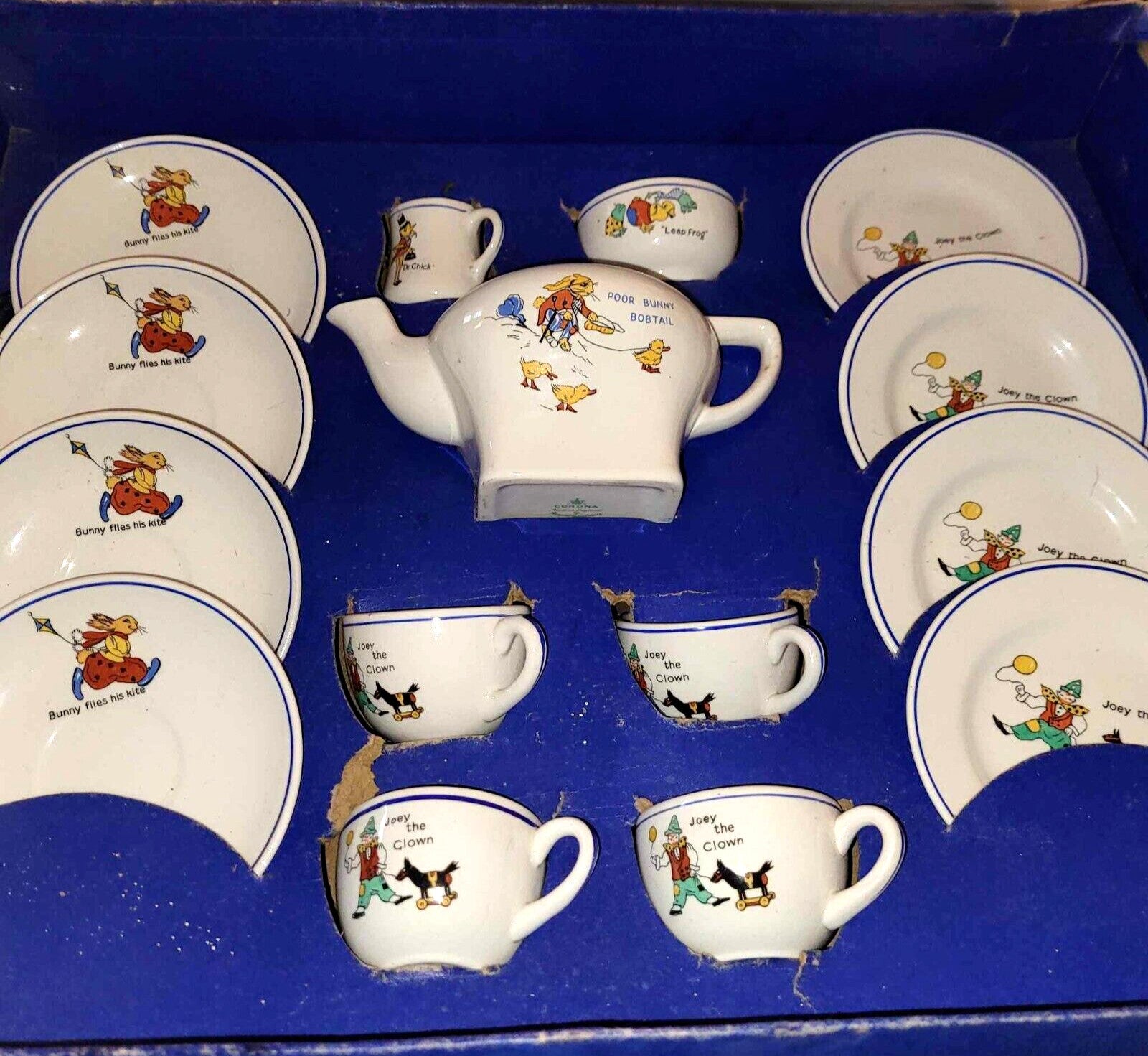 complete Child’s Antique Teaset by Corona Bunny Bobtail Joey The Clown Ceramic