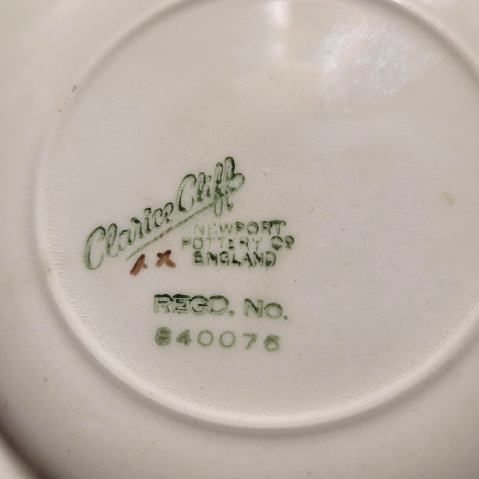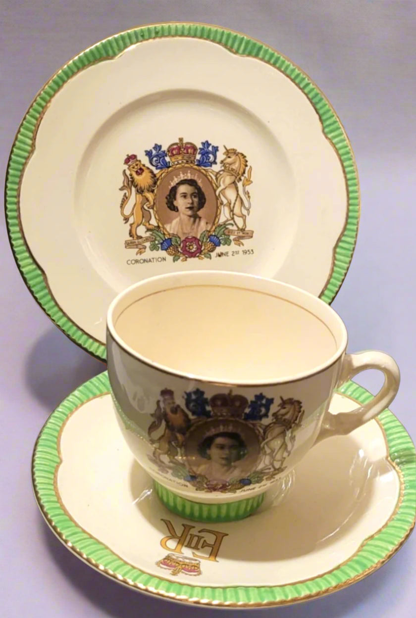 Clarice Cliff Coronation Cup, Saucer , plate trio 1953 Queen Elizabeth II Green