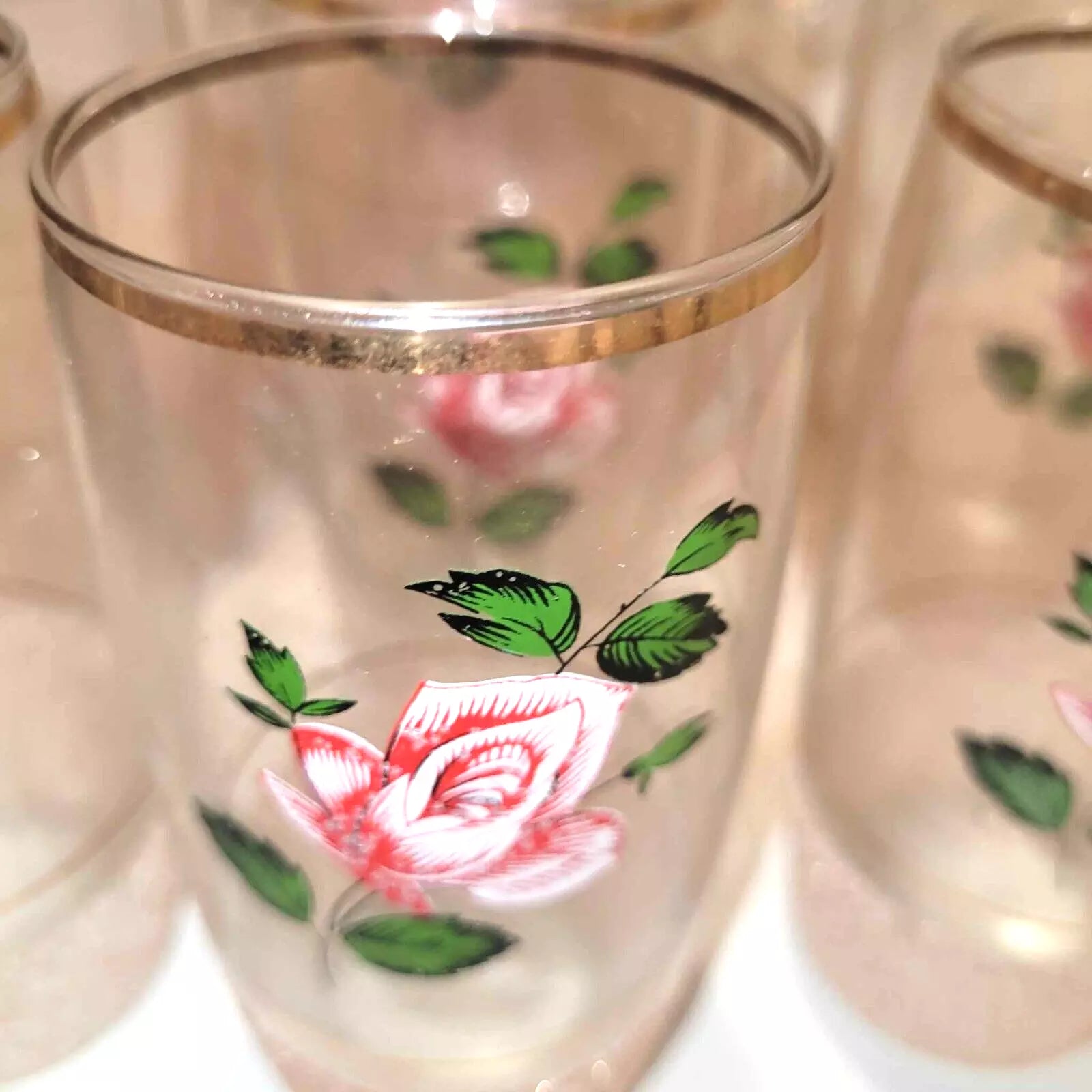 Elevate your home bar decor with this vintage pink sugar frosted glass jug and set of 6 glasses. The ditsy rose design and 1950s rockabilly flair adds an artistic touch to any gathering. Transport yourself back in time with this exclusive and elegant set.